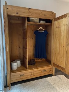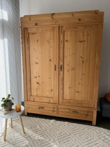Die Mitteleinteilung, die Kleiderstange und ein Einlegeboden sind im Original vorhanden. Weitere Einlegeböden können auf Anfrage hin angefertigt werden. Die Außenmaße des Schrankes betragen:
